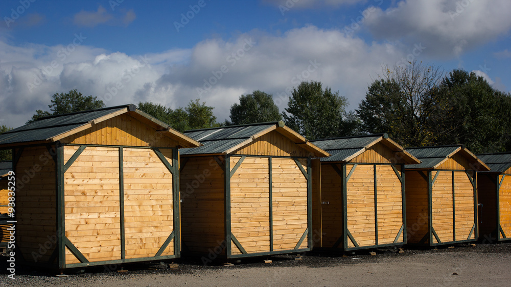 Outdoor closed yellow wooden stalls with a blue sky in the background
