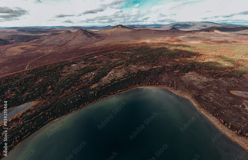 Autumn landscape in the tundra. Mountains, volcanoes, lakes, colored yellow leaves, bright colors