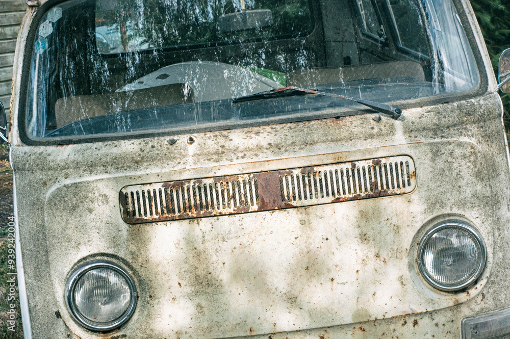 avant d'un véhicule vintage, carrosserie rouillée
