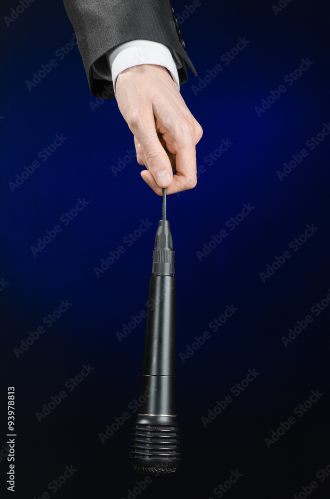 Business speech and topic: a man in a black suit holding a black microphone on a dark blue background in studio isolated