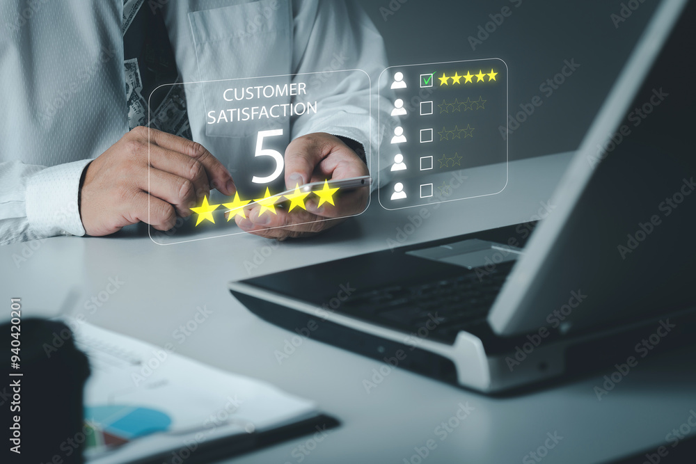 Users rate service experience 5-star rating, experience evaluation survey, feedback, business quality, service, best compliments Customer service evaluation concept