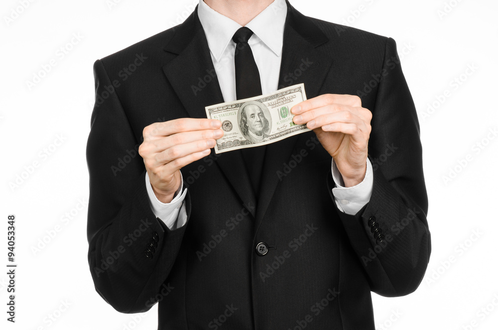 Money and business theme: a man in a black suit holding a bill of 100 dollars and features a hand gesture on an isolated white background in studio