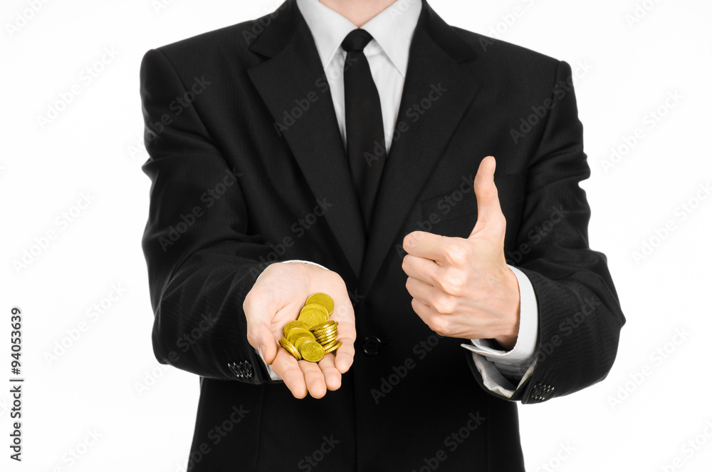 Money and business theme: a man in a black suit holding a pile of gold coins in the studio on a white background isolated