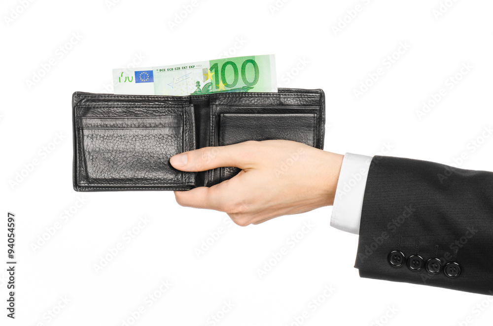 Money and business topic: hand in a black suit holding a wallet with 100 euro banknotes isolated on white background in studio