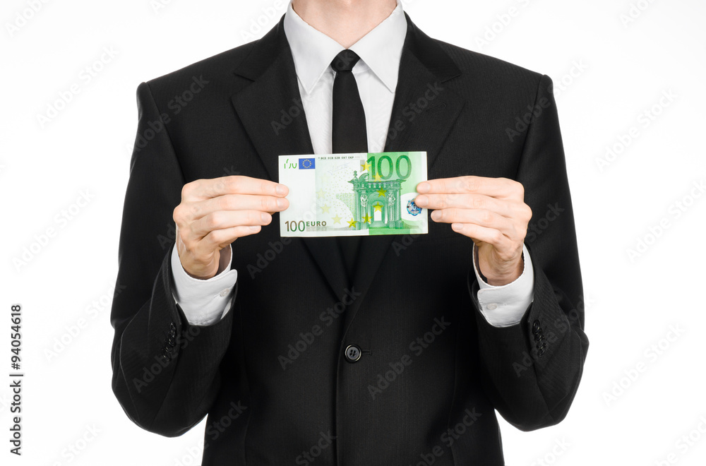Money and business theme: a man in a black suit holding a bill of 100 euros and shows a hand gesture on an isolated white background in studio