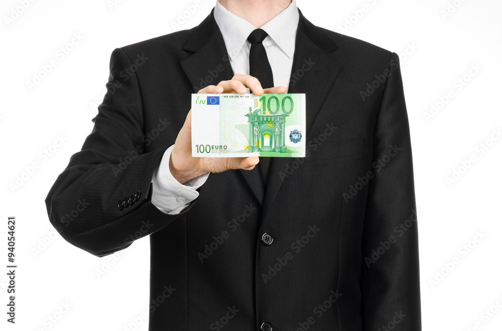 Money and business theme: a man in a black suit holding a bill of 100 euros and shows a hand gesture on an isolated white background in studio