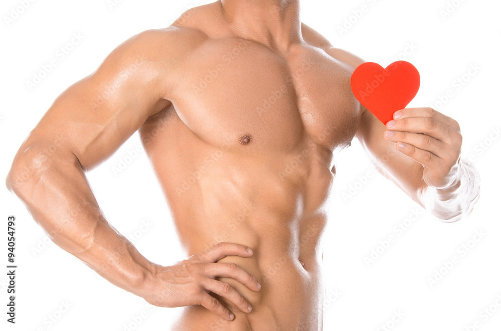 Bodybuilding and Health: handsome strong bodybuilder holding a paper card red heart isolated on a white background in studio