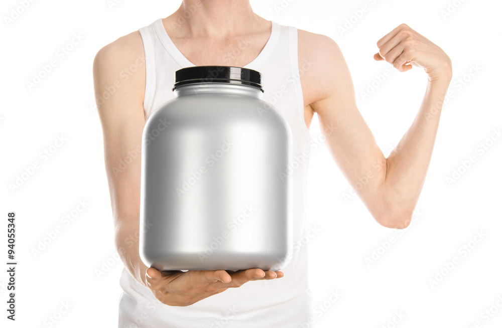 Bodybuilding and Sports theme: a thin man in a white T-shirt and jeans holding a plastic jar with a protein isolated on a white background in studio