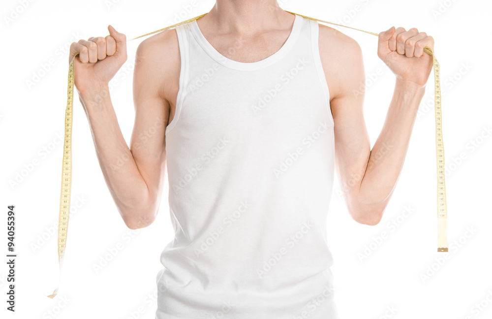 Bodybuilding and Sports theme: a thin man in a white T-shirt and jeans with measuring tape isolated on a white background in studio