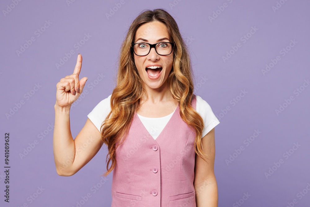 Young excited successful employee business woman corporate lawyer wear white t-shirt vest glasses holding index finger up with great new idea isolated on plain pastel light purple background studio.