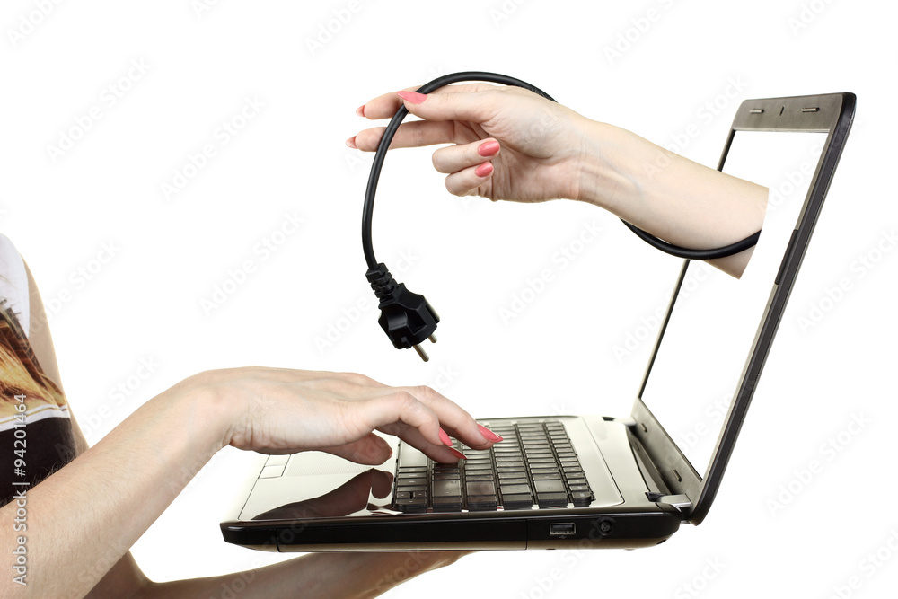 discharged the laptop in the hands of a young and beautiful girl isolated on white background