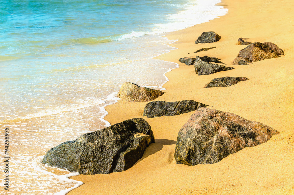 Turquoise waves of water flowing stones on beach