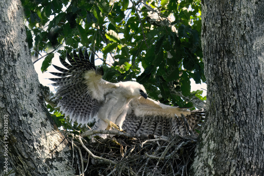 4 month old Harpy Eagle chick, Harpia harpyja, doing flight exercise in the nest, Alta Floresta, Amazon, Brazil