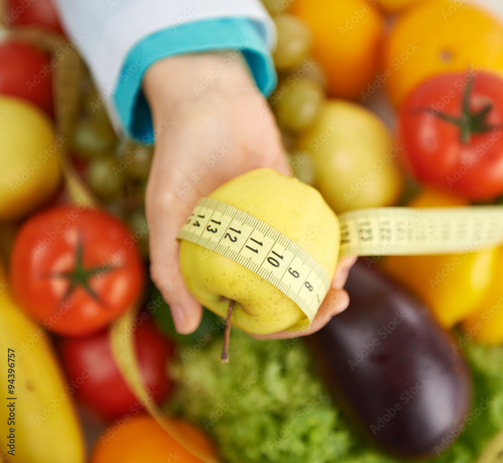 Doctor dietitian holding apple and measuring tape over eco nutrition background. Concept of health care, diet and vegetarian food.