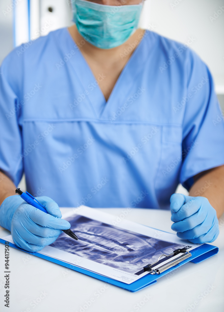 Man surgeon examining tooth disease of patient in dental clinic. Teeth treatment concept.