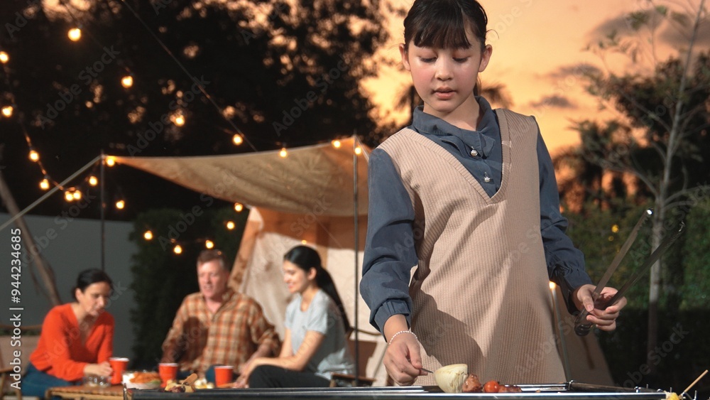 Family gather celebrate holiday, Adorable child grill food for family member. Outdoor camping activity to relax with tasty meal and spend time with young generation cross generation gap. Divergence.
