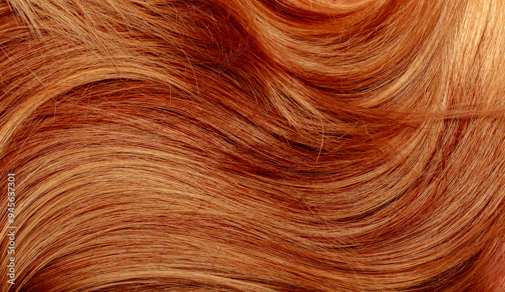 Red hair close-up as a background. Women's long orange hair. Beautifully styled wavy shiny curls. Hair coloring bright shades. Hairdressing procedures, extension.