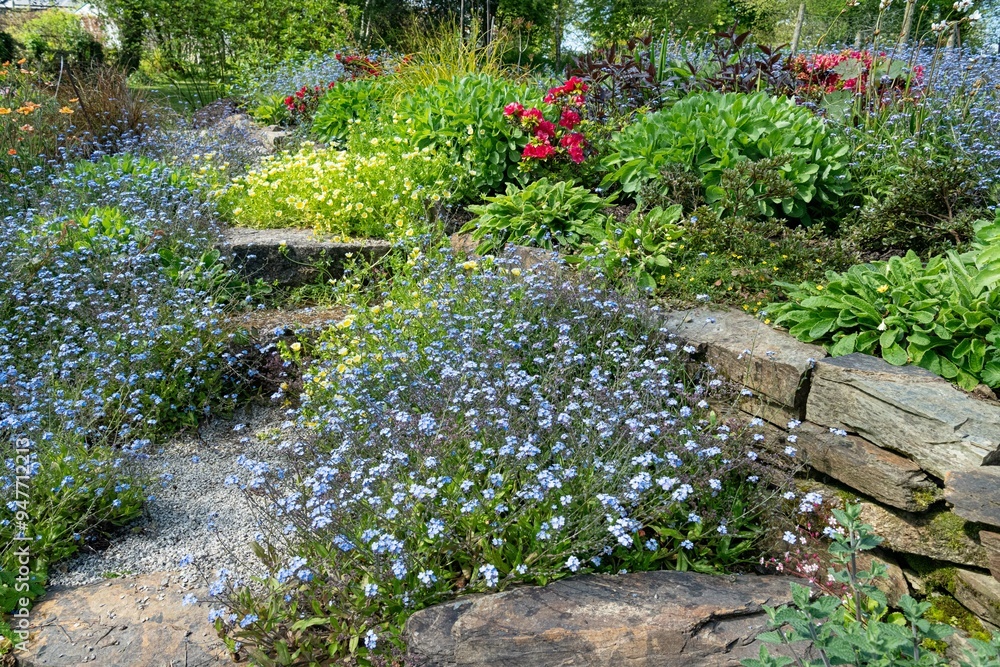 English cottage garden planting with forget-me-nots at the front