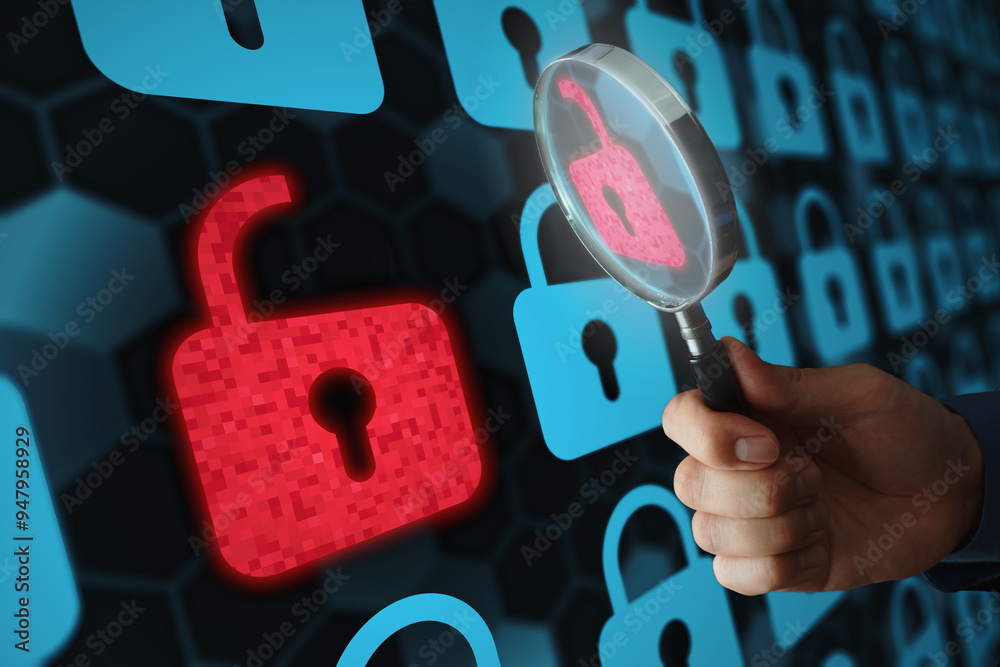 Security engineer identifying information security vulnerability in internet network system. Unlocked padlock icon and many other locked padlock icons. Hand holding magnifying glass.