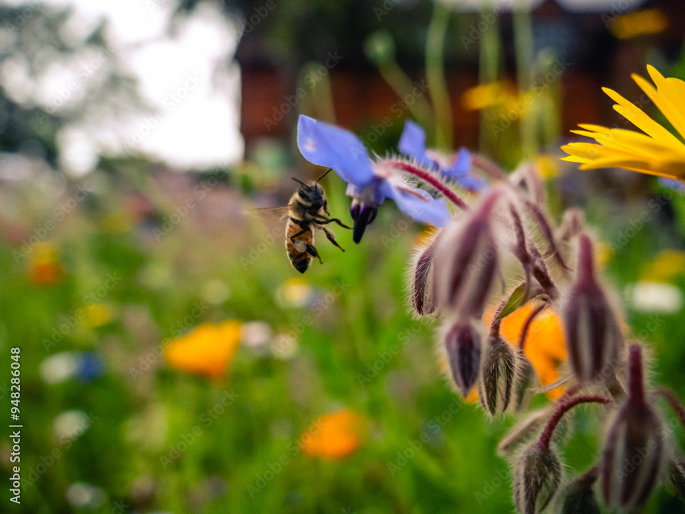 A bee gathers nectar from vibrant blue flowers in a blooming garden during a sunny spring afternoon