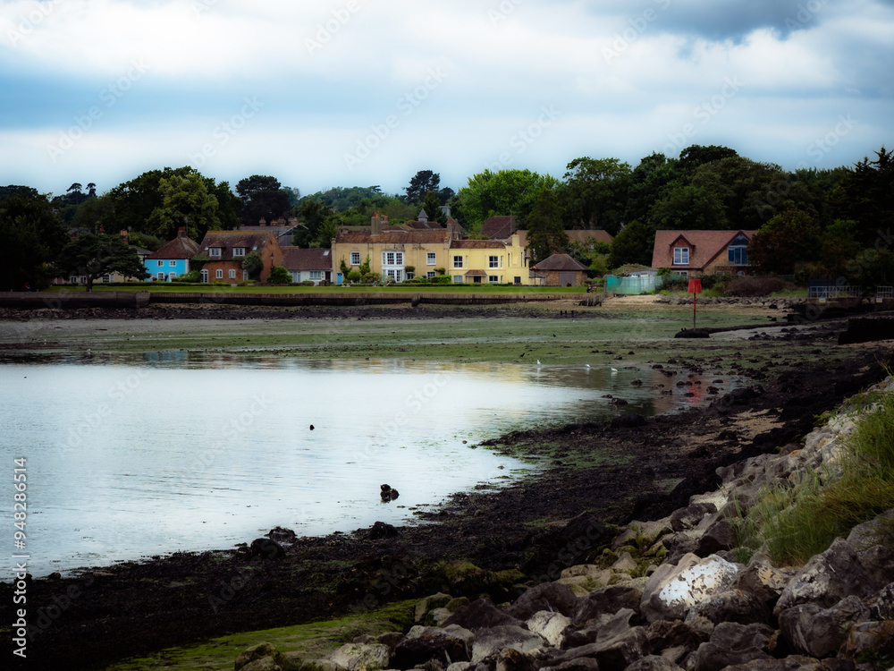 Charming coastal houses along a rocky shoreline in a serene seaside environment during overcast weather