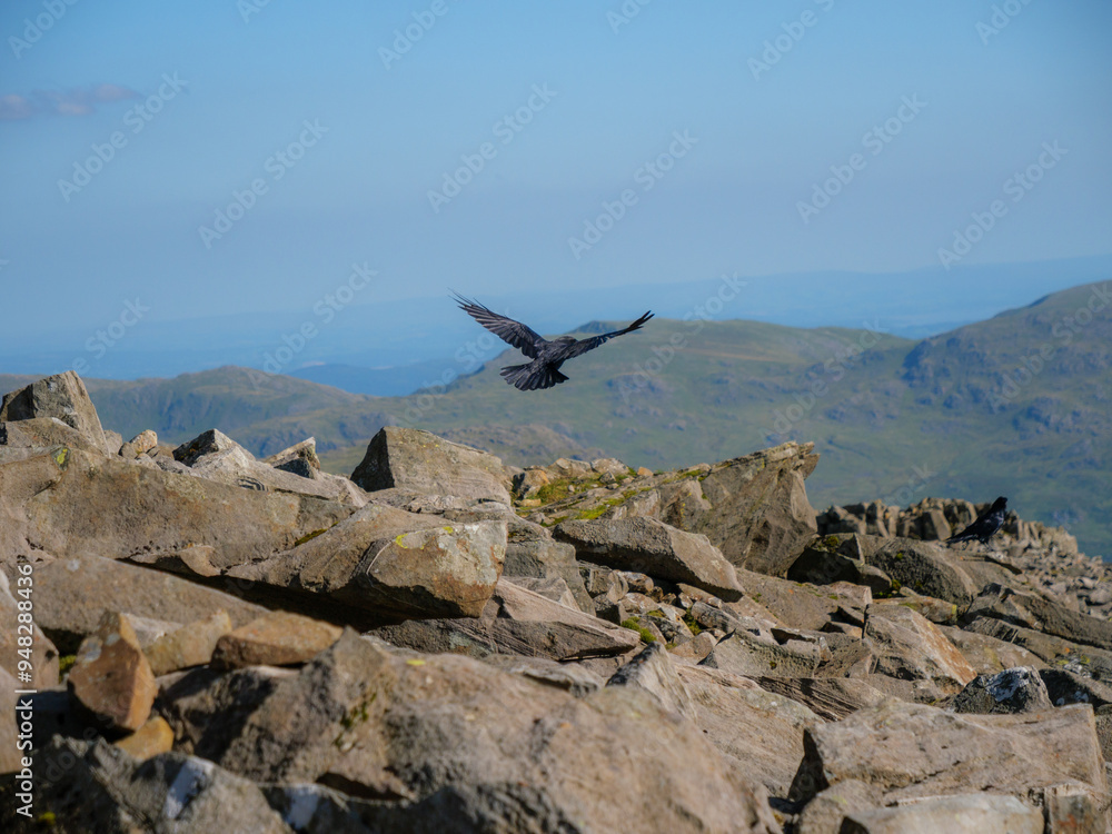 A solitary bird soars above rocky terrain in a scenic mountain landscape on a clear day