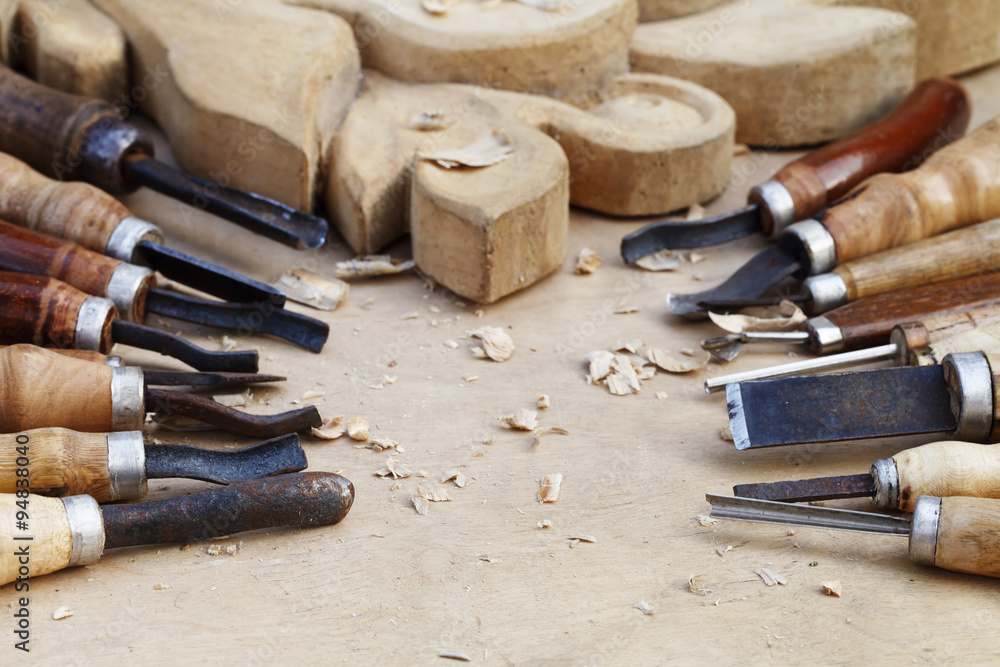 wood carvings, tools and processes work closeup