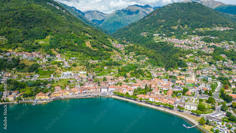 An aerial view of Domaso, a beautiful village nestled on the shores of Lake Como, Italy, captured by a drone. This charming destination is known for its picturesque lakeside scenery, quaint streets