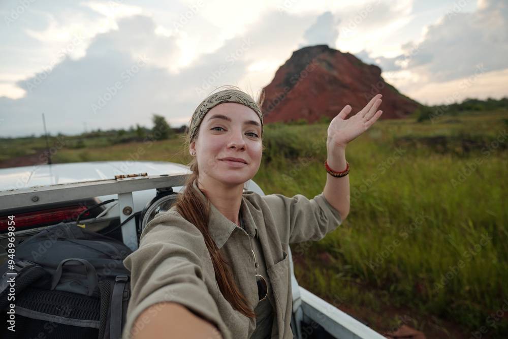 Young satisfied female traveler and blogger looking at camera and waving hand to online audience while recording new video for her vlog