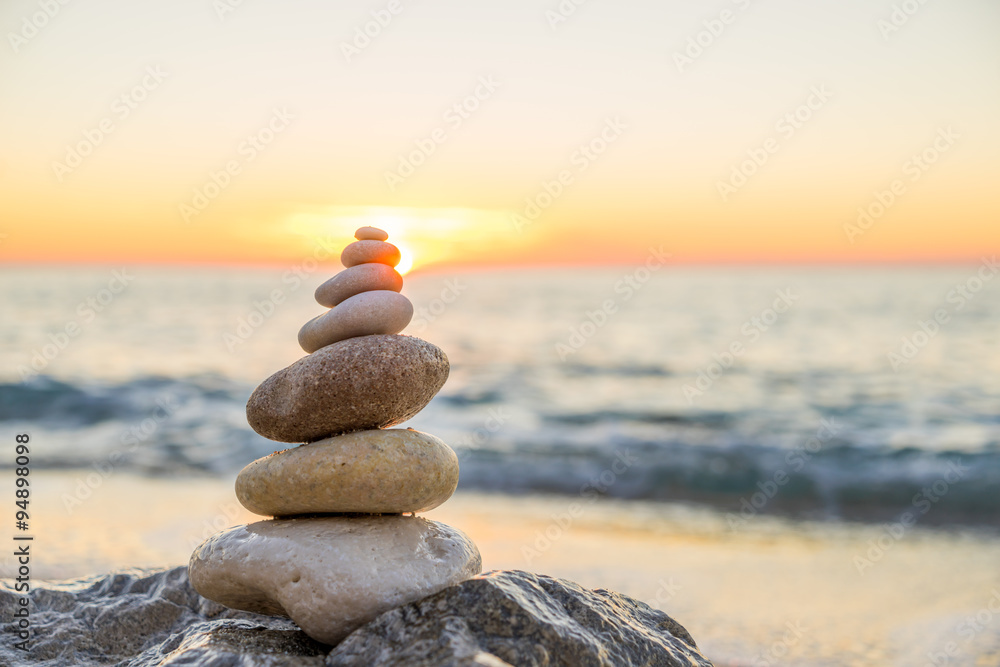 Stones pyramid on sand symbolizing zen, harmony, balance. Ocean