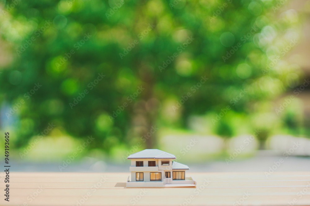 住宅模型と緑ぼかし背景