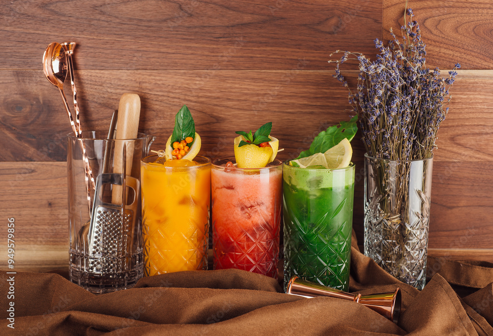 Three colorful cocktails standing on table with cocktail shaker and lavender