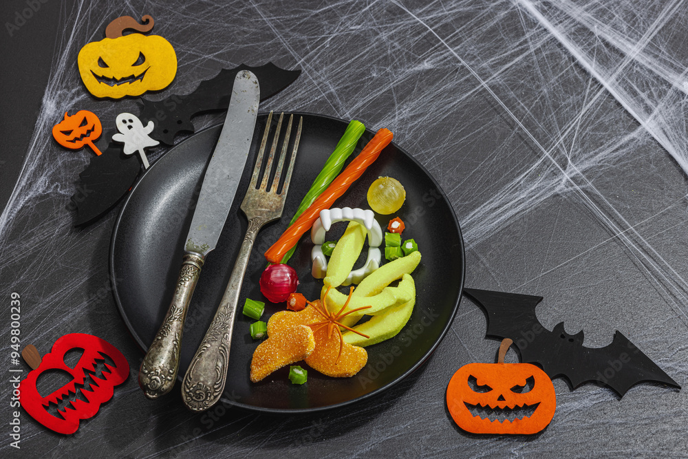 Table setting, traditional festive composition for Halloween party. Funny seasonal props