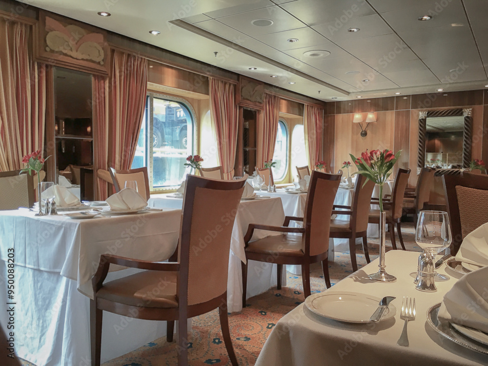 Art Deco interior design style furniture, carpets and paneling onboard classic ocean liner cruiseship cruise ship main dining room restaurant