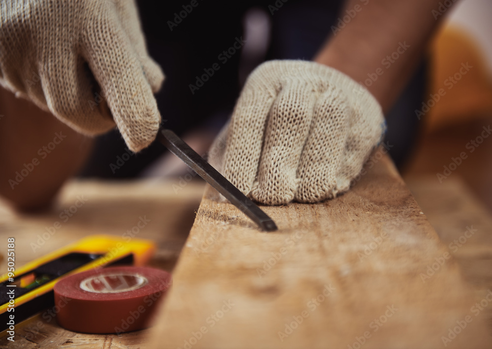 Male carver's hands with chisel working with beam in workshop. Skilled craftsman carving wood.