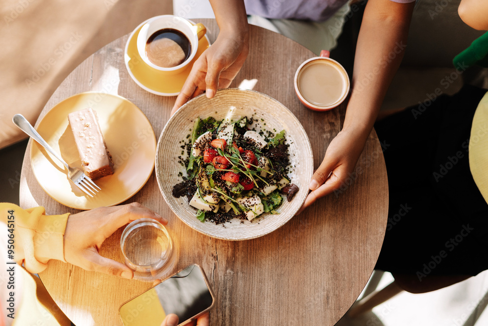 Top view three friends sharing healthy vegan lunch in a modern restaurant