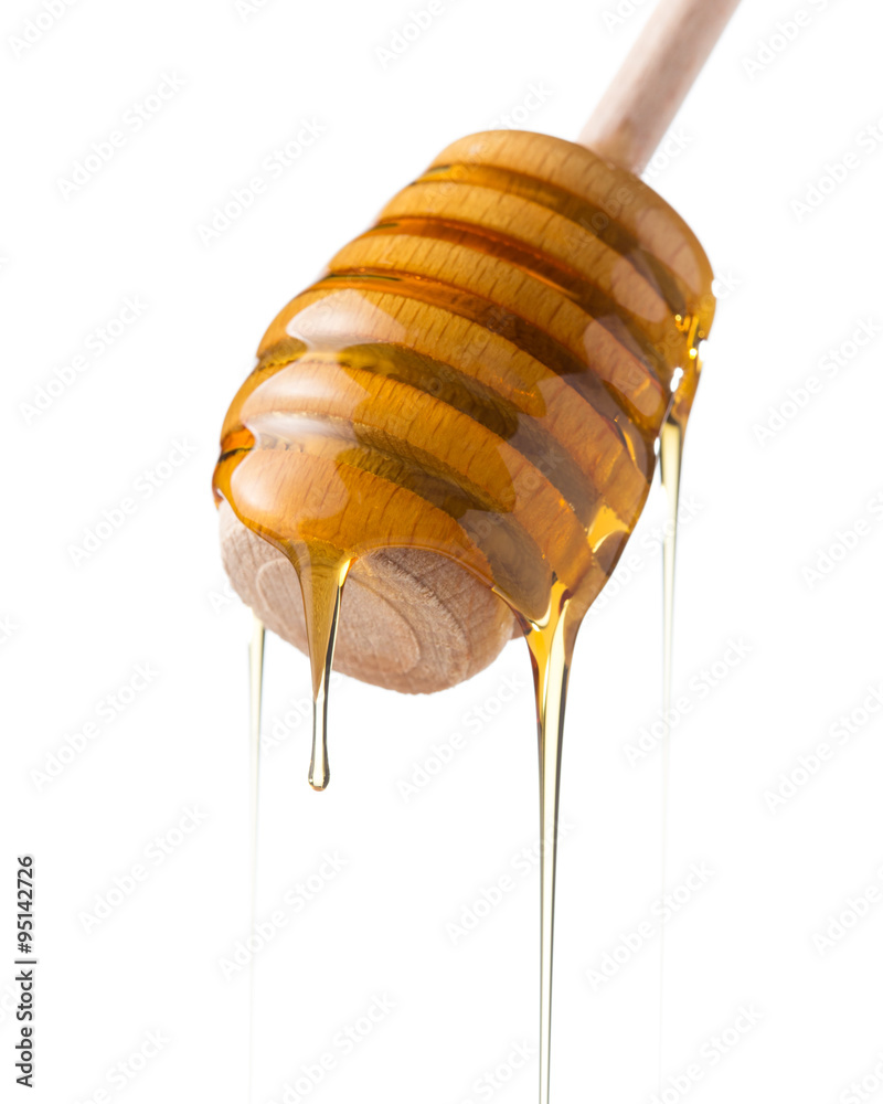 Mel escorrendo de uma colher de mel bastão individualizado em fundo branco neutro