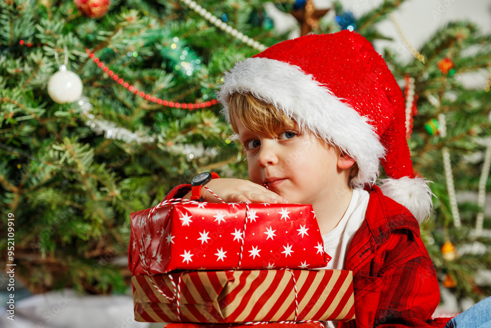 Portrait of kid in Santa hat celebrates Christmas with gifts