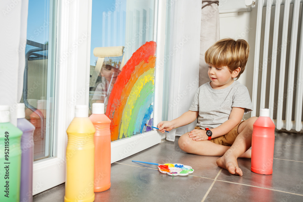 Little artist paints a vibrant rainbow on glass door, happily