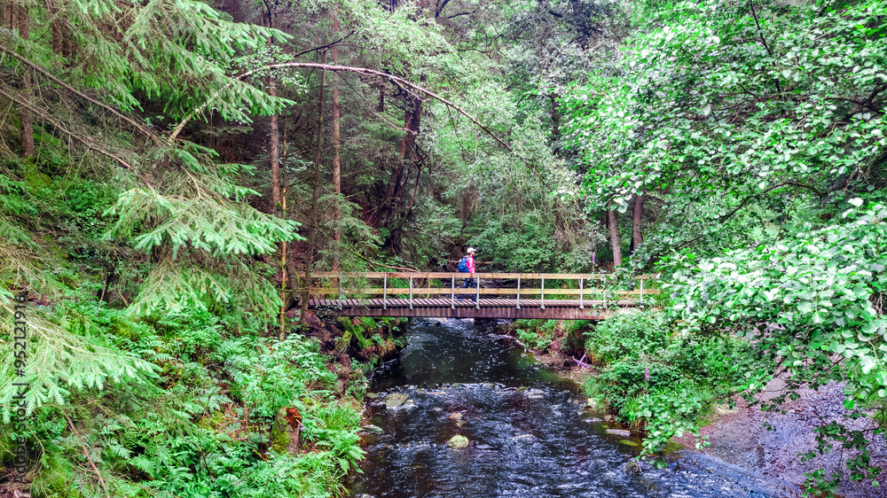 Traveler woman with backpack hiking, hiker crosses wooden bridge in forest trail in Ardennes, Belgium