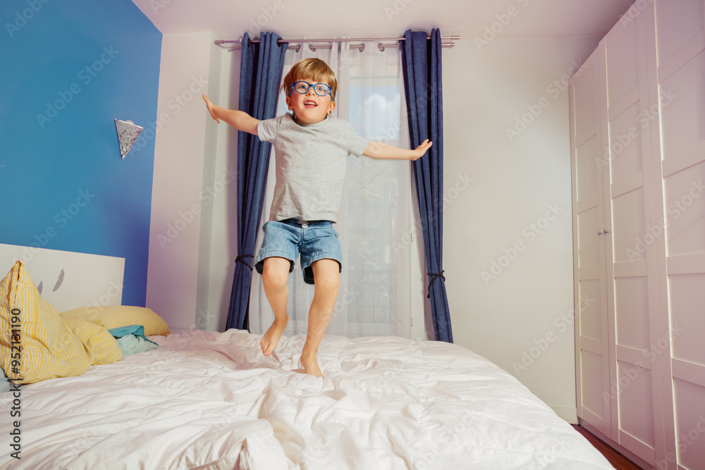 Energetic boy in glasses jumps on the bed at a tidy bedroom