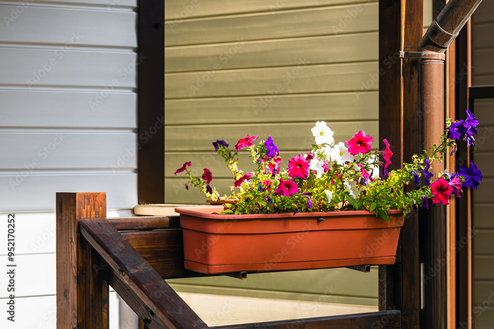Folgende Fotos können Ihr Interesse wecken: topf, petunia, hängend, petunia, veranda, blütenblätter, haus