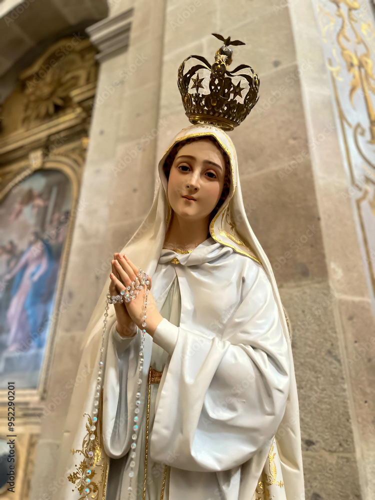 Image of Our Lady of Fátima with Crown and hands folded in prayer in the Basilica of Santuario do Sameiro in Bom Jesus do Monte, Braga, Portugal.