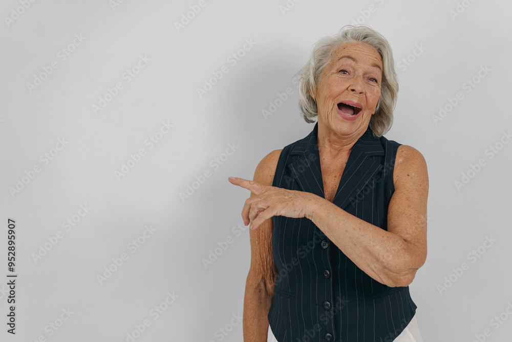 A joyful elderly woman engaging with great enthusiasm while pointing and smiling cheerfully against a plain backdrop