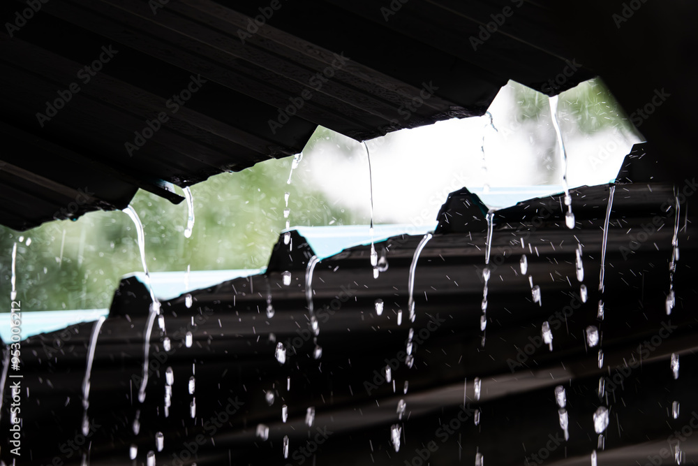 A roof with rain pouring down on it. The rain is falling in a steady stream, creating a peaceful and calming atmosphere. The roof is covered in raindrops, which adds to the sense of tranquility