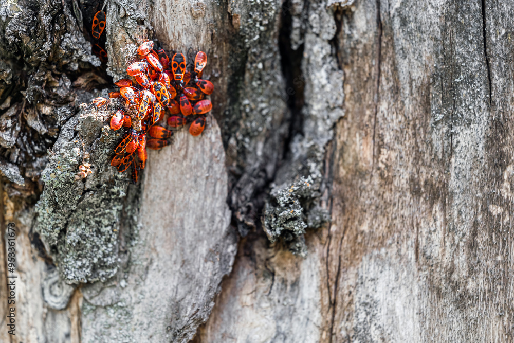 red bugs sit on the bark of a tree. soldier bug on a tree trunk. red bug infestation. place for inscription