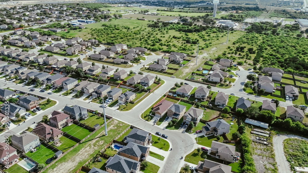 Quiet residential street in new construction houses community suburbs San Antonio, row of two story suburban single-family homes in urban sprawl encroachment with vacant land for growth, aerial