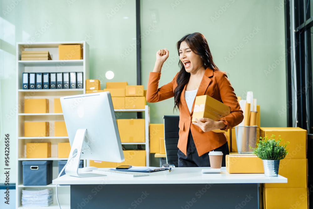 successful Asian businesswoman happily celebrates her achievements during Pride Month, overcoming office syndrome and receiving congratulations for thriving LGBTQ-owned shipping and retail business.