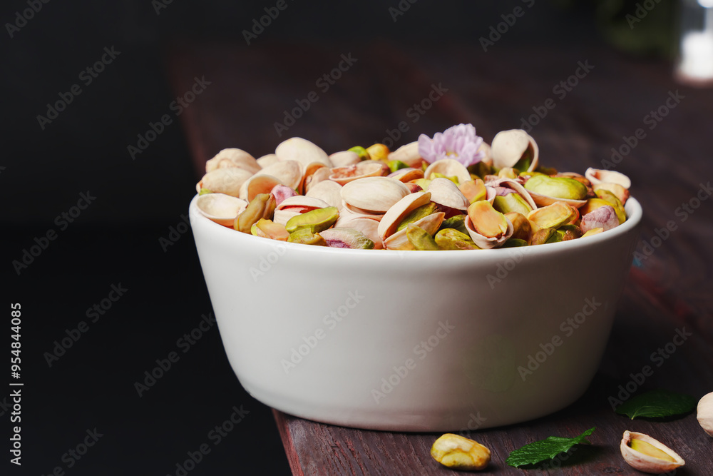 Shelled and unshelled Pistachios filled white bowl placed on a dark wooden rustic table