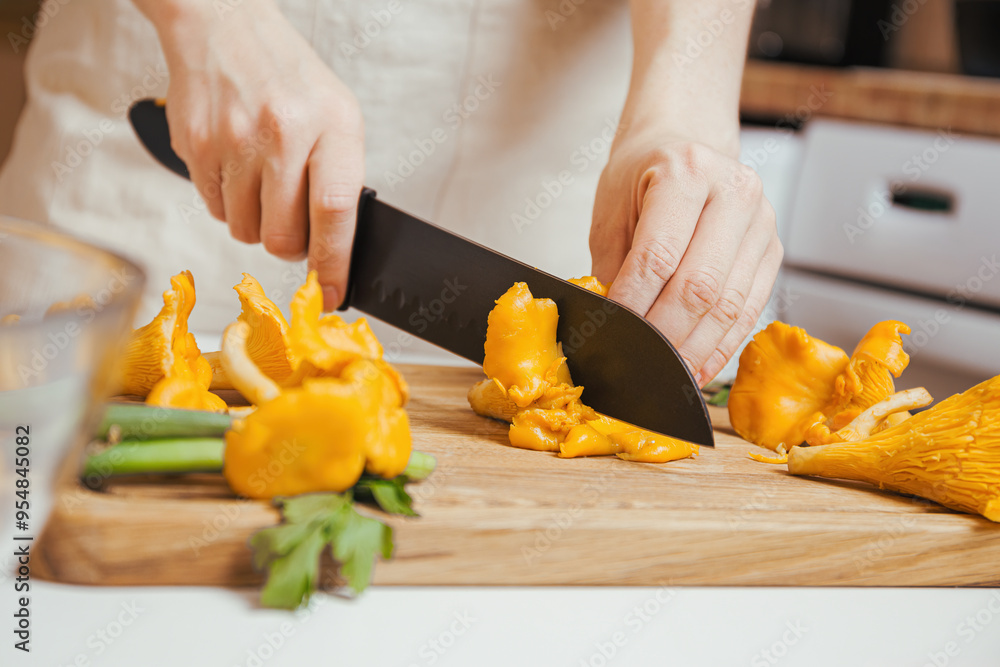 Chopping Fresh Chanterelle Mushrooms on Wooden Cutting Board